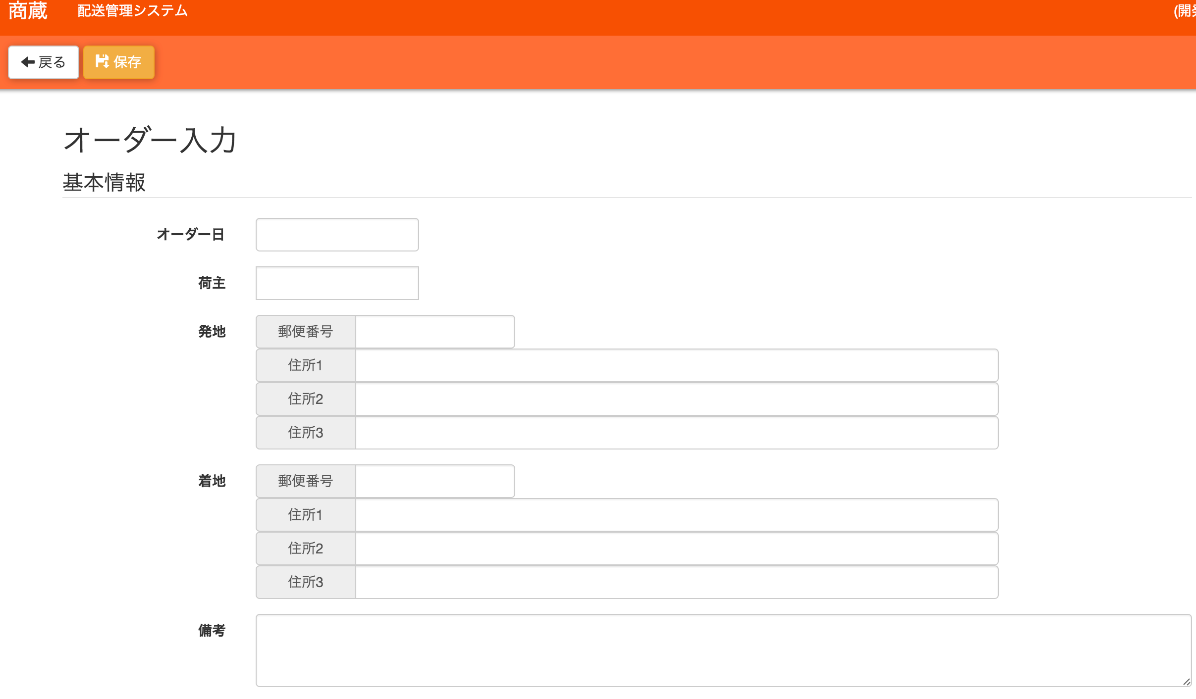 このアプリケーション、幾つかの画面で構成されているのですが、あなたには主に「オーダー登録画面」という画面作成を担当してもらいます。この画面は、荷物を運んで欲しい人(荷主と言います)から運送会社への配送依頼(メール or 電話)を記録するための画面です。