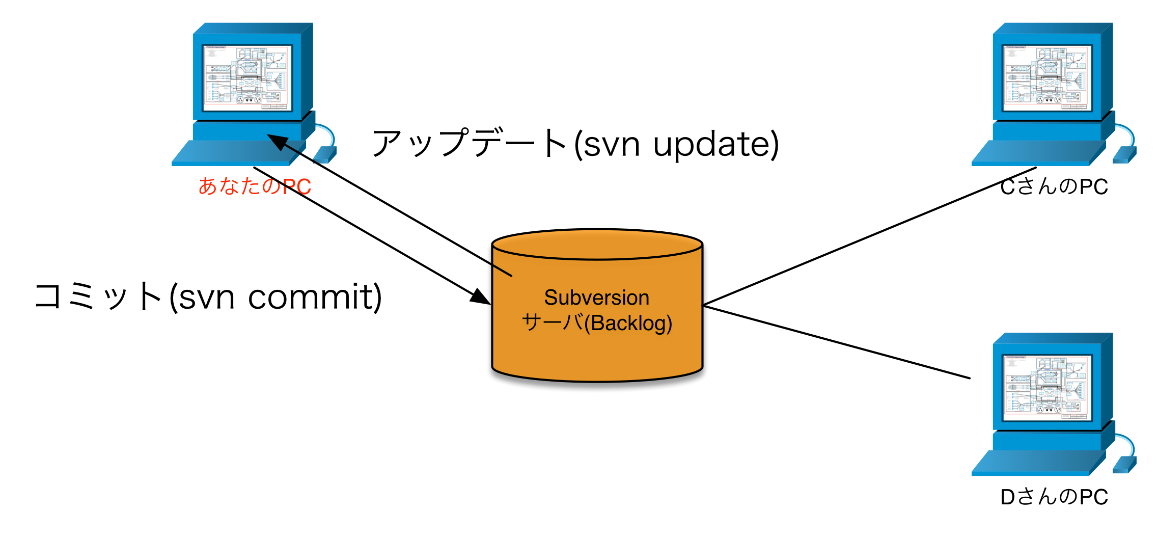 - この構成のため、ローカルPCで改造したソースコードは、完成したらSubversionにアップロードする必要があります。アップロードのことをコミットと言います。