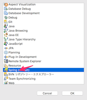 パースペクティブ選択ダイアログの中からSpringを選択し、「OK」をクリックします。