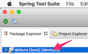 起動したら、Springパースペクティブを選択し、Package Explorer ビューからakikuraプロジェクトを選択してください。