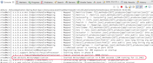 実行にはしばらく時間がかかります。Consoleビューに起動処理の状況(ログと言います)が表示されるので、「Started AkikuraApplication in X.XXX seconds...」のように表示されればアプリケーションの起動に成功しています。